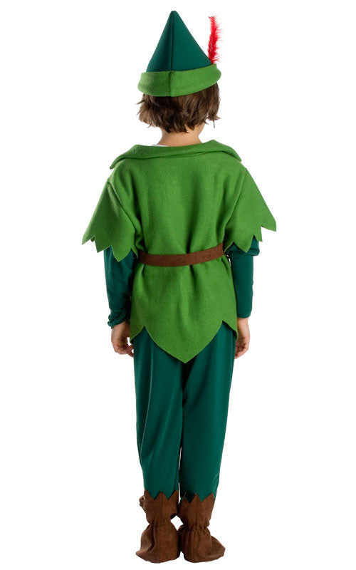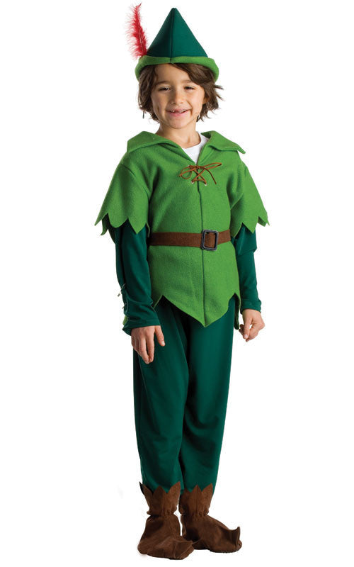 • Includes a green, short-sleeved shirt with attached dark green sleeves, dark green pants, brown belt, and shoe covers, and classic Peter Pan hat.