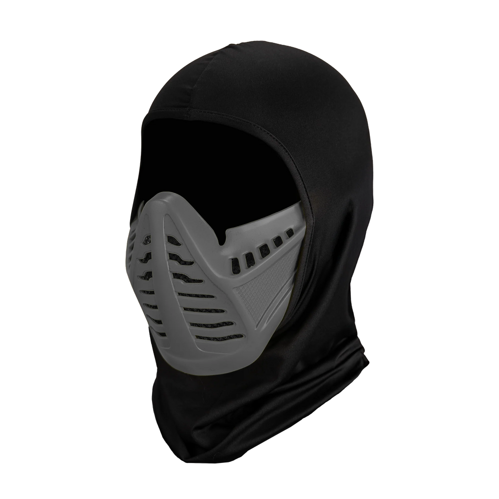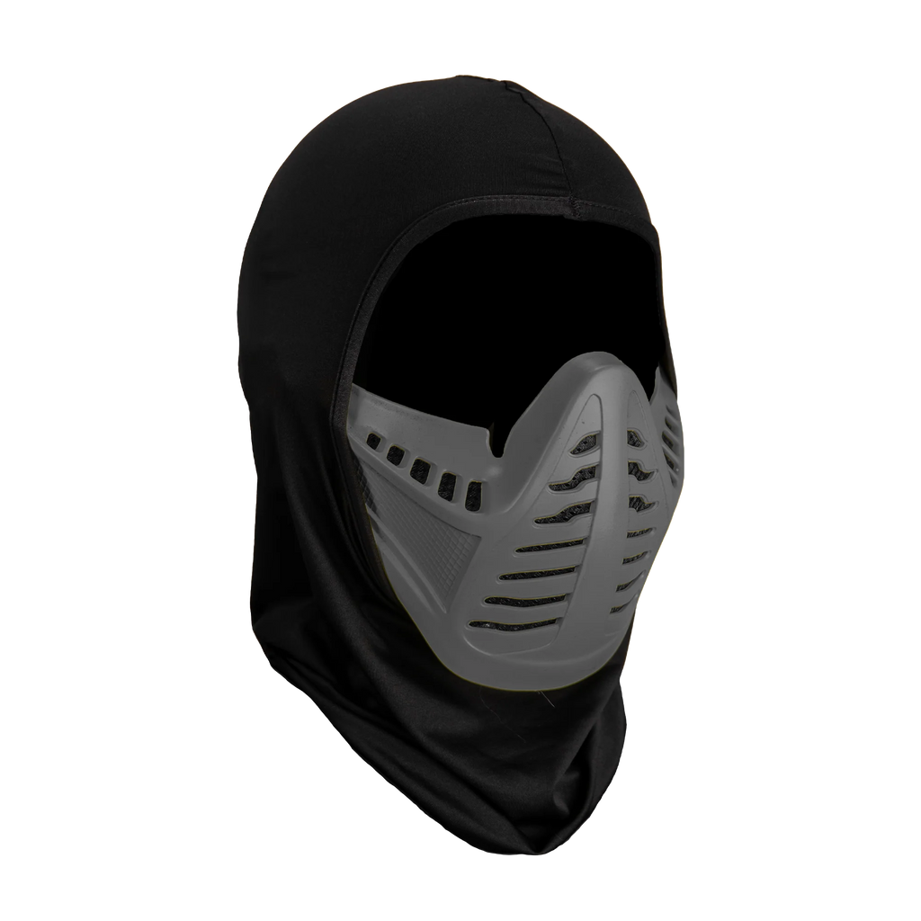 - Features a rigid plastic sculpt with a sleek, stealth‑forward ninja design, finished in dark charcoal, segmented mask sections across the mouth and jaw, and black cloth hood