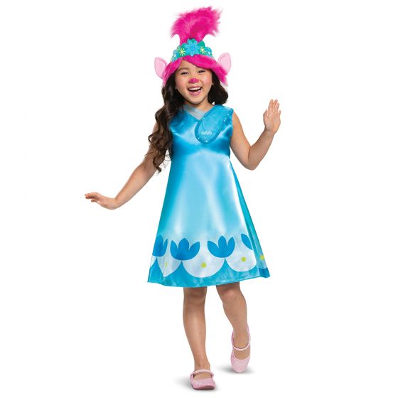 - Incluye el icónico vestido azul de Poppy y un tocado con cabello rosa intenso adjunto, orejas adjuntas y corona azul a juego.