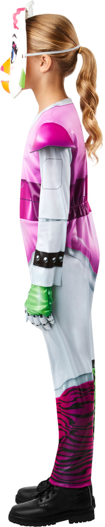 • Includes jumpsuit with shoulder pads and printed details, matching gloves, and Chica mask
