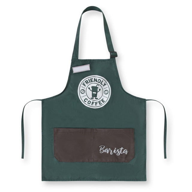 • Incluye delantal verde con el logo "Friendly Coffee" y bolsillos negros, gorra negra a juego y etiqueta con nombre.