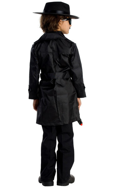 • Incluye una chaqueta tipo gabardina negra, gafas negras y bigote.