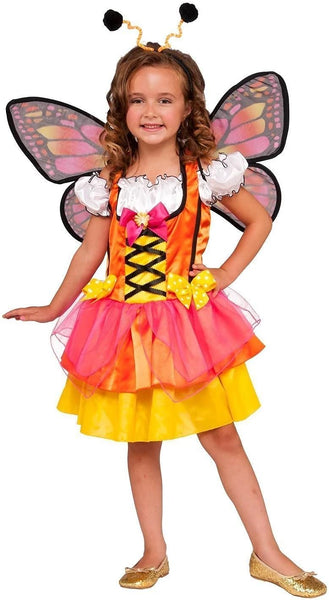 - Features pink, orange, and yellow dress, butterfly wings, and antennae headband
