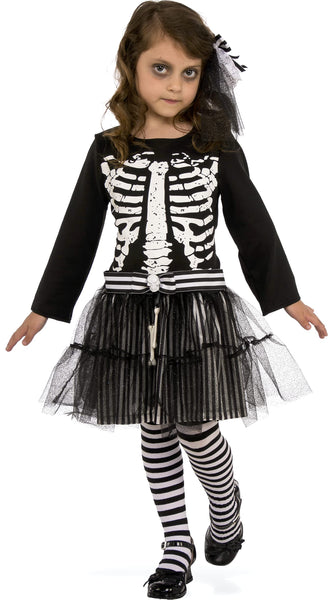 El pequeño disfraz de esqueleto incluye un vestido con corpiño de hueso de esqueleto impreso, detalle de calavera en la cintura y un lazo para el cabello. Talla grande. Tu pequeño será la combinación perfecta de dulce y aterrador este Halloween.