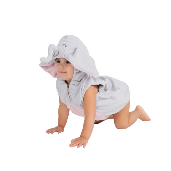 - Comprend une barboteuse grise avec une touche de rose sur le ventre et une capuche attachée avec des oreilles d'éléphant souples, des yeux brodés et une trompe en peluche