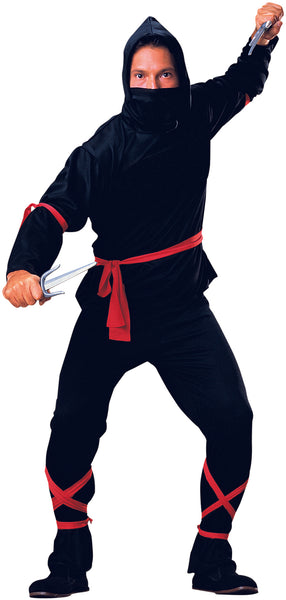 Costume de ninja noir pour homme - comprend : foulard pour le visage, chemise à capuche, attaches pour les bras, ceinture, pantalon et attaches pour les jambes.