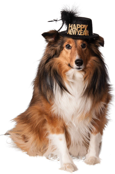 Chapeau de fête pour animal de compagnie en noir avec plumes noires et lettres dorées pailletées pour dire « bonne année ». Taille de l'animal de compagnie : moyenne à grande.