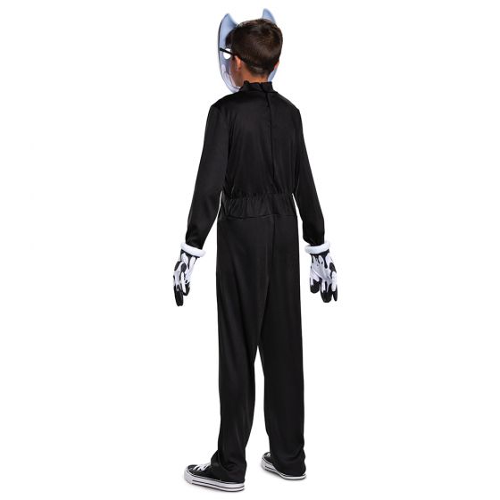 - Includes black jumpsuit with printed white bow tie, Ink Bendy half mask, and a pair of gloves