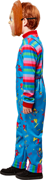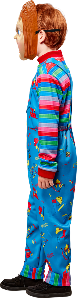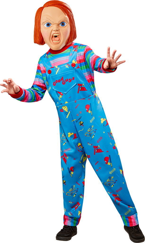 • Includes jumpsuit with printed rainbow shirt and blue overalls with printed graphics and Good Guys, and Chucky face mask