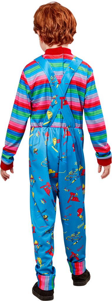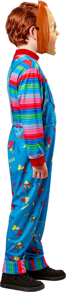 - Includes jumpsuit with printed rainbow shirt and blue overalls with printed graphics and Good Guys, and Chucky face mask